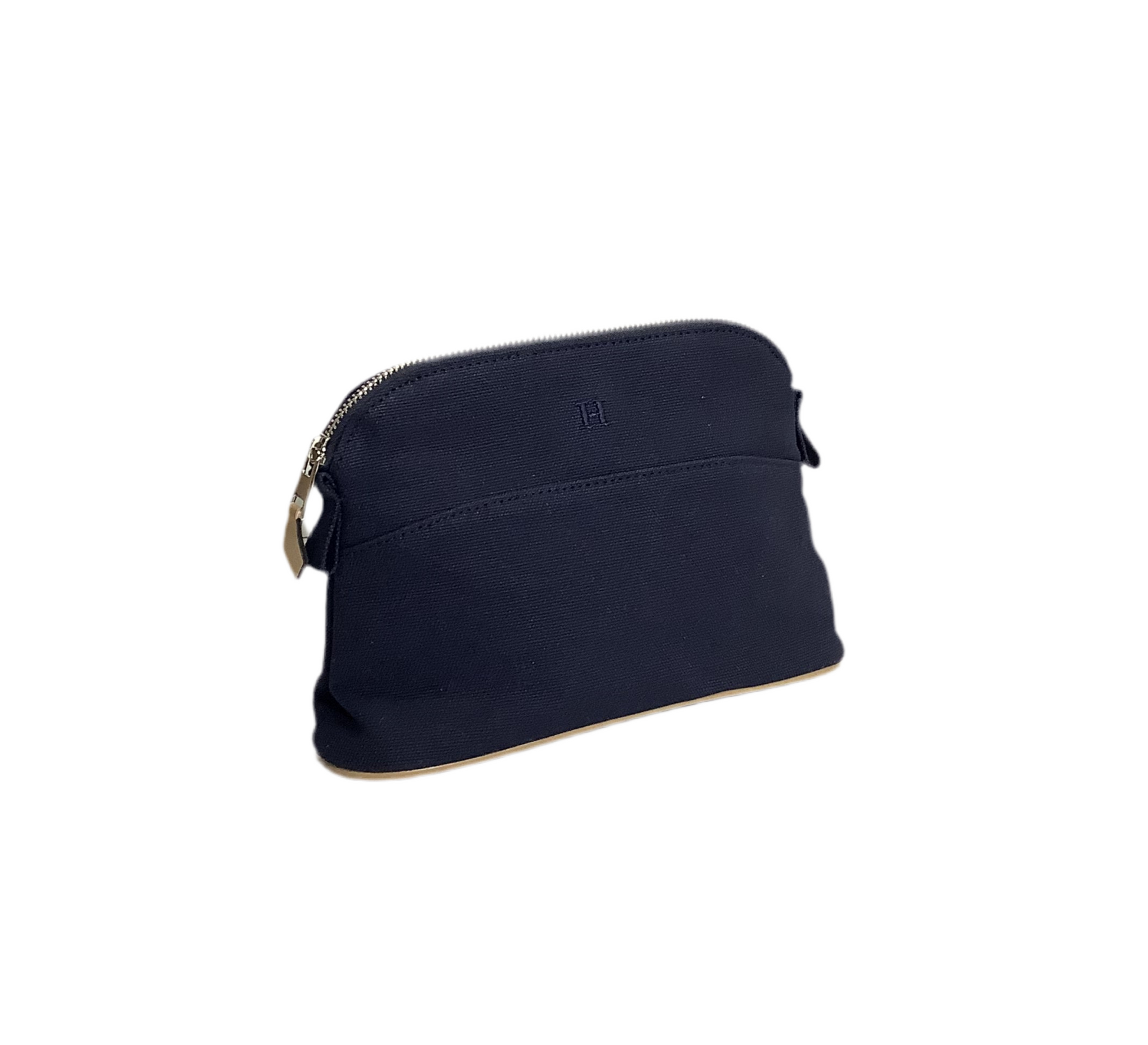 Indulge in luxury with our H Cosmetic Bag in navy. Made with durable canvas and secured by a sleek metal zipper, this bag is perfect for all your cosmetic or toiletry essentials. The lined interior adds a touch of sophistication, making it the perfect accessory for any stylish jetsetter. Travel in style with our exclusive bag.